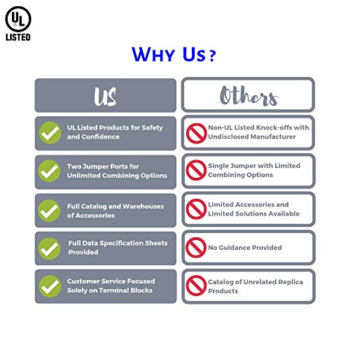 - UL 600V Rating. Optimal safety: End stops are included to keep the terminal block assembly tightly in place. These terminal blocks are built to such tight specifications.